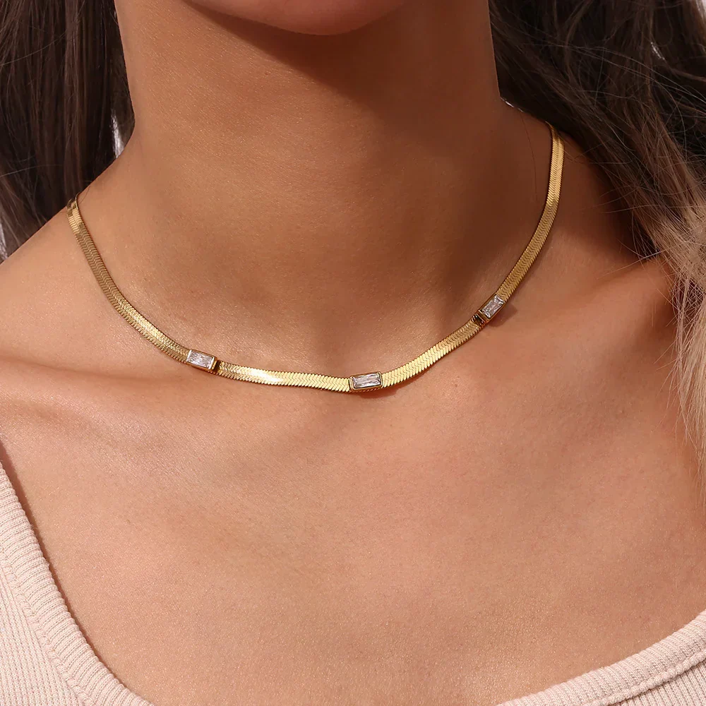 A refined and sophisticated piece of jewelry, Eve showcases a smooth Gold chain embedded with diamond simulants that easily adds an eye-pleasing contrast to your look.